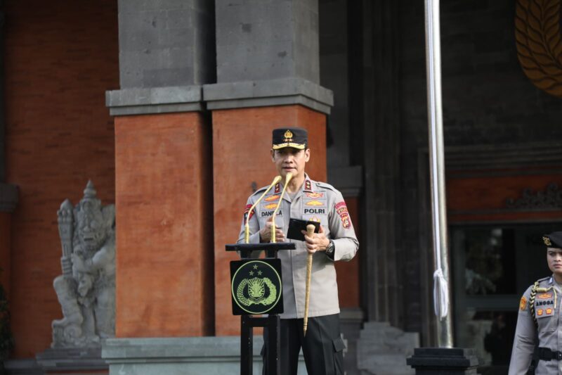 Bali, radarbalinews.com- Kepala Kepolisian Daerah Bali, Irjen Pol. Daniel Adityajaya, S.H., S.I.K., M.Si., memimpin apel jam pimpinan di halaman depan Mapolda Bali, Senin 9 Maret 2026.